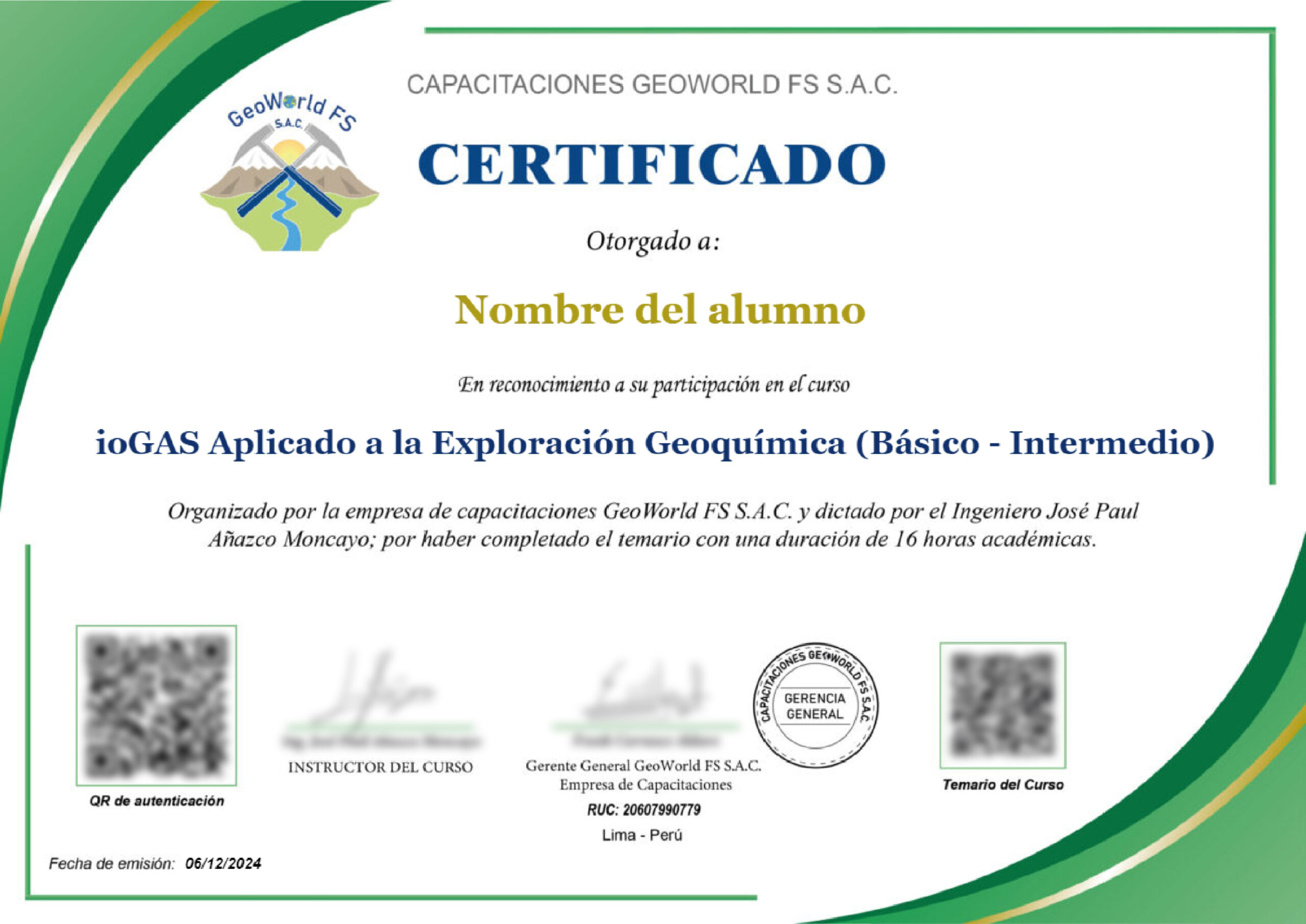 Al final de cada curso, recibirás un certificado con código QR único e incorruptible a nombre de GeoWorld FS SAC y del profesional altamente califado encargado del curso.